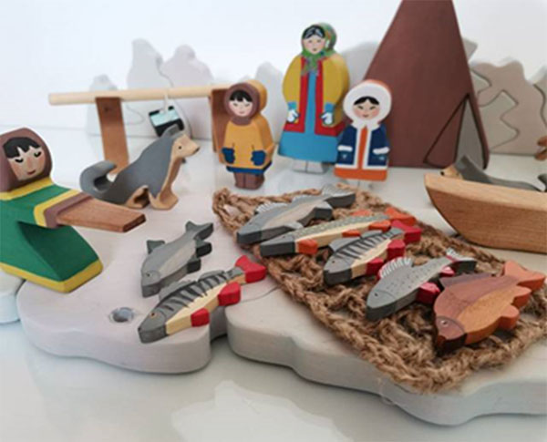 Игровой набор из дерева состоит из не менее 49 деревянные фигурки: чум, рыбак, мужчина с хореем, сеть рыболовная, рыбки, дети, женщина, олени, собаки; лодка, подставки для костра, костёр, палка для костра, котелок на джутовой ниточке, сани; снежный покров-пазл из 17 кусочков, которые собираются в единый пласт, на одном элементе обозначен прорубь.