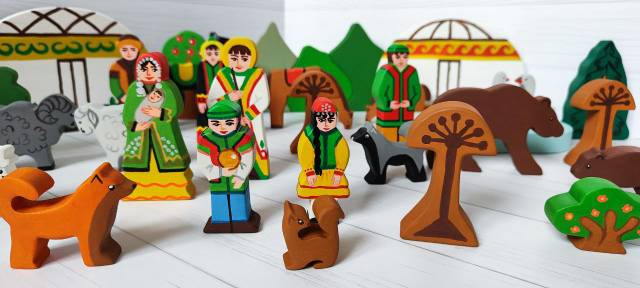 В составе игрового набора из дерева имеется не менее 35 деревянных фигурок: юрты, кони, овцы, утки, собаки, фигурки детей, женщины, мужчины в костюмах с башкирским национальным орнаментом, мужчина-кураист, улей, водоём, горы, кустики, деревья, цветок курая.