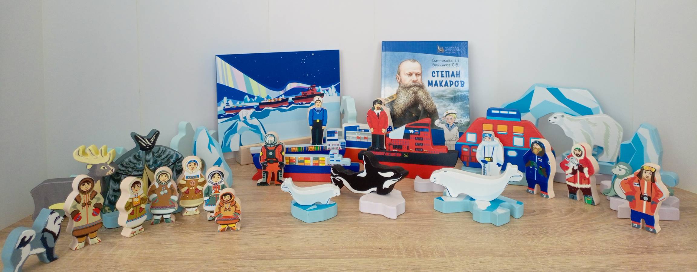 Фигуры людей: полярник-исследователь с фотоаппаратом; полярник-биолог с тюленем; полярник-исследователь в синем с биноклем; глубоководный водолаз; капитан; моряк в форме; полярник-метеоролог в маскировочном комбинезоне с ледовым буром и эхолотом; рыбак; мужчина; женщина; дети — мальчики и девочки.
